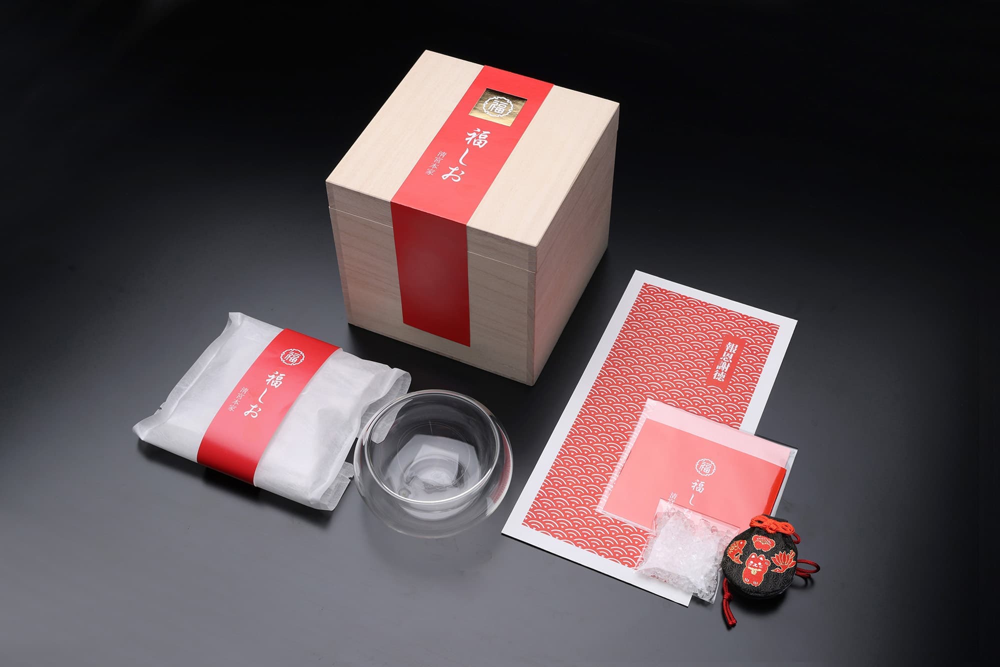 青海波封筒、福寄せ巾着、持ち塩極み福しお(さざれ)、薬包紙、しおり
